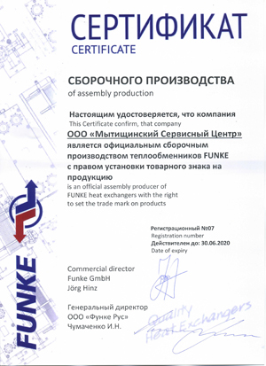 Является официальным сборочным производством и сервис-центром FUNKE. Расположение в непосредственной близости от Центрального склада комплектующих FUNKE в России даёт компании существенное преимущество в сроках производства и снижении логистических затрат. Квалифицированный инженерно-технический персонал оперативно произведёт расчёт по теплогидравлическим характеристикам, изготовит теплообменные аппараты, произведёт комплектацию ЗИП и отгрузку самовывозом или доставку на терминал транспортной компании.