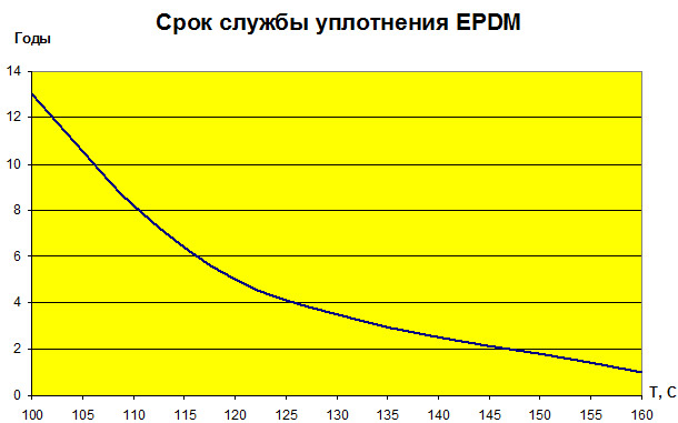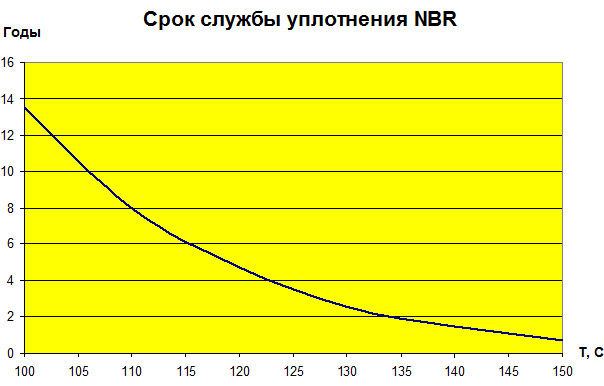Как видно из этой зависимости, чем меньше значение рабочей температуры по сравнению с максимально допустимым для данного вида уплотнений, тем больше срок службы уплотнения.