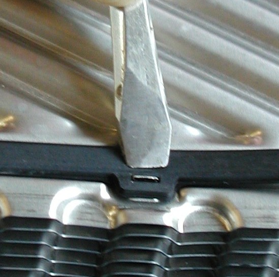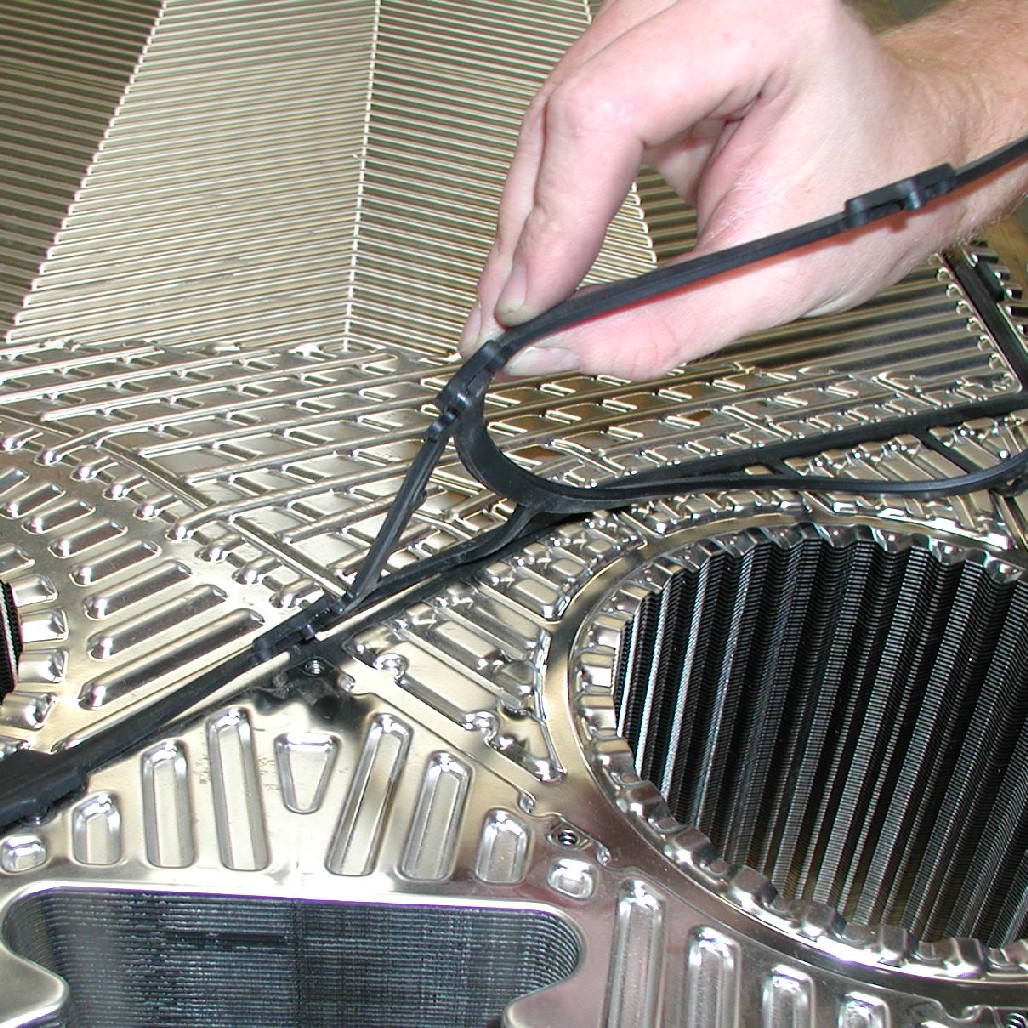 Указание: некоторые типоразмеры пластин имеют кроме канавки уплотнения также выдавленный язычок крепления, в который также вставляется уплотнение. Эта операция выполняется с помощью короткой отвёртки.