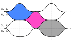 При зеркальном расположении каждой второй Off-Set пластины с одинаковым профилем также возможно создание симметричных каналов. Преимущество асимметричных каналов состоит, прежде всего, в том, что одна из сред, участвующих в процессе теплообмена, может протекать в значительно большем объеме при меньших потерях давления. Для чувствительных сред и сред с высокой степенью вязкости предлагаются пластины с широкими теплообменными каналами, в то время как для экономно используемых сред применяются пластины с более узкими каналами. На рис. 2 показано, каким именно образом могут быть сформированы широкий, узкий и средний каналы благодаря комбинации пластин с тупым углом наклона (Н – с широкими углублениями, G – с узкими углублениями). Аналогичные каналы могут быть сформированы из пластин с острым углом наклона рельефа пластин (L – с широкими углублениями, К – узкими углублениями).